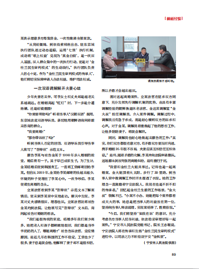 “我曾和金桂兰大姐共事过。记得也是一起离婚案,金大姐顶着大太阳,步行了20里路,到当事人家中做调解工作时汗水湿透了衣服。她的工作理念一直激励着宁安法院人,我现在也是不折不扣的传承者。”回忆起金桂兰生前的工作场景,“金大叔”敬佩不已,“小案不小办,她能把每个案件都看成天大的事,她总是把当事人的利益放在第一位,坚持向当事人释法说理,实现案结事了,胜败皆服。”