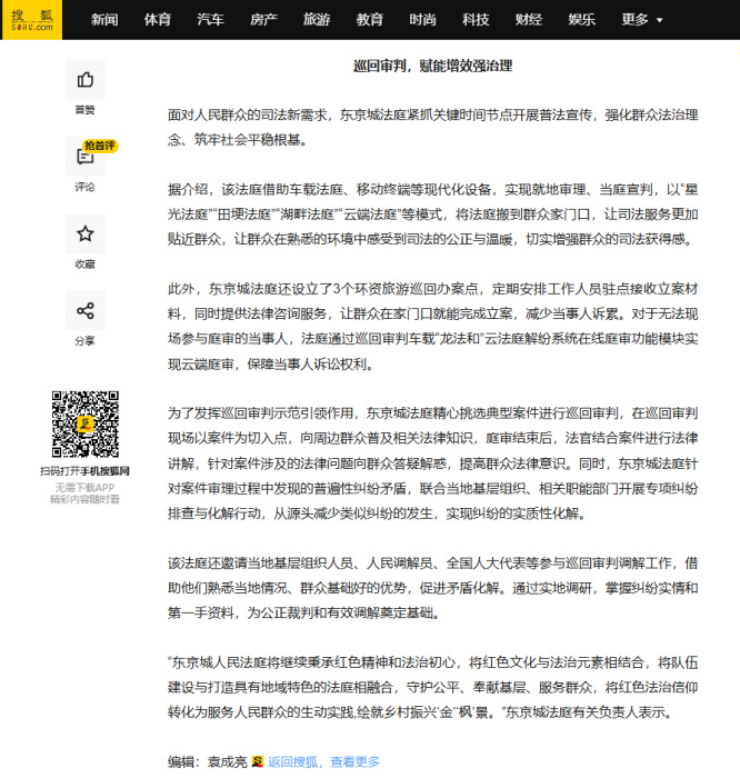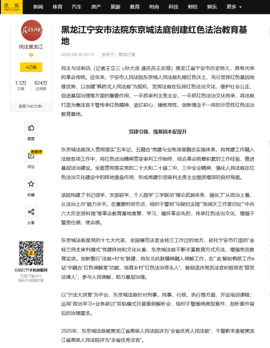 2025年9月30日,《搜狐网》转载了《民主与法制》报道的《黑龙江宁安市法院东京城法庭创建红色法治教育基地》一文,对宁安市人民法院东京城人民法庭扎根红色沃土,充分发挥红色基因地缘优势,以创建“枫桥式人民法庭”为契机,发挥法庭在弘扬红色法治文化、维护社会公正、促进基层治理等方面的重要作用,一手抓审判主责主业,一手抓红色法治文化传承,将法庭打造为集法官干警传承红色精神、追忆初心、锤炼党性、创新理念于一体的示范性红色法治教育基地的事迹进行报道。
