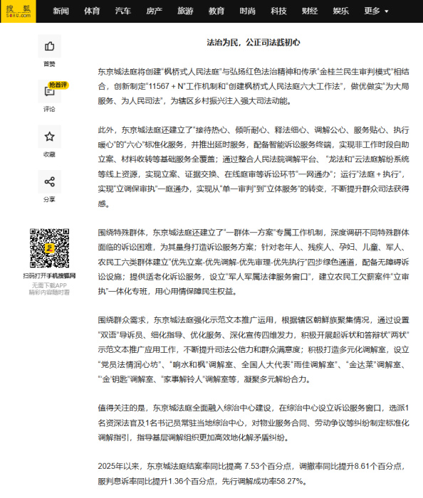 2025年以来,东京城法庭结案率同比提高7.53个百分点,调撤率同比提升8.61个百分点,服判息诉率同比提升1.36个百分点,先行调解成功率58.27%。