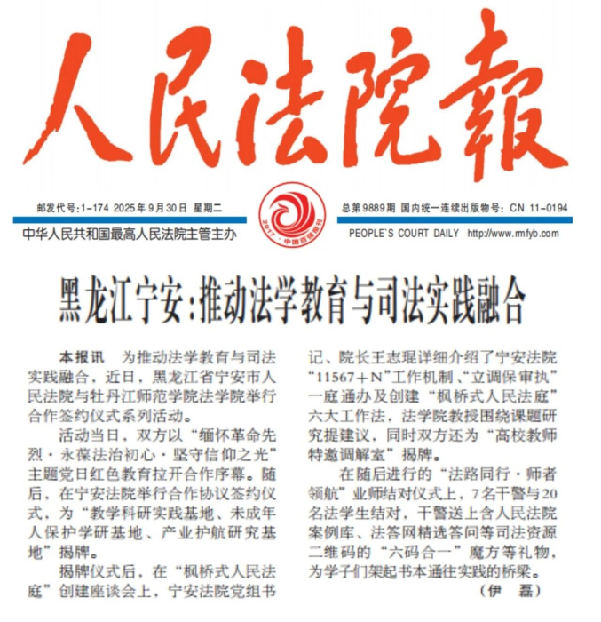 近日,《人民法院报》刊发了《黑龙江宁安:推动法学教育与司法实践融合》,对宁安市人民法院与牡丹江师范学院法学院举行合作签约仪式系列活动进行报道。