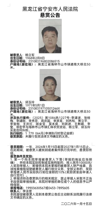 悬赏公告丨宁安市人民法院执行悬赏公告(2026年第二期)