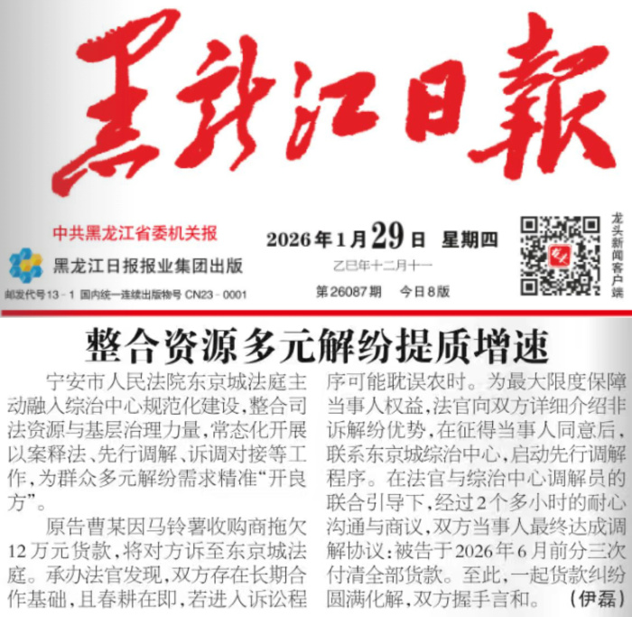 2026年1月29日,《黑龙江日报》刊发宁安市人民法院《整合资源多元解纷提质增速》。