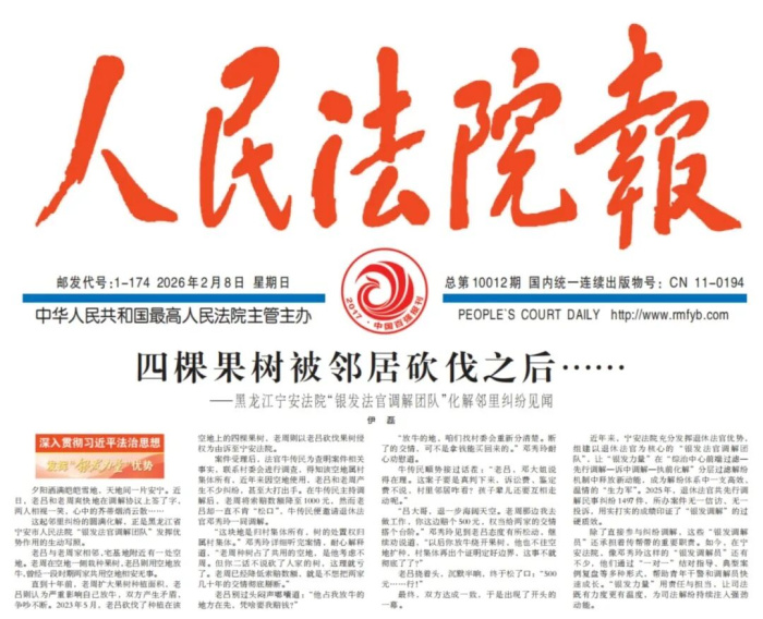 2026年2月8日,《人民法院报》刊发《四棵果树被邻居砍伐之后——黑龙江宁安法院“银发法官调解团队”化解邻里纠纷见闻》,对宁安市人民法院发挥“银发力量”作用的典型案例进行了报道。