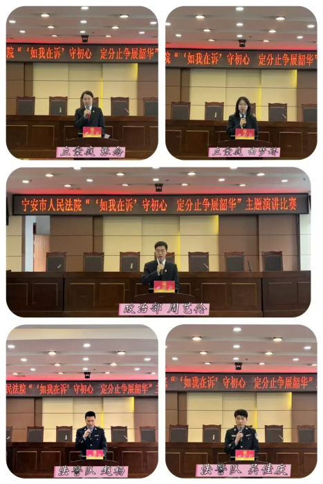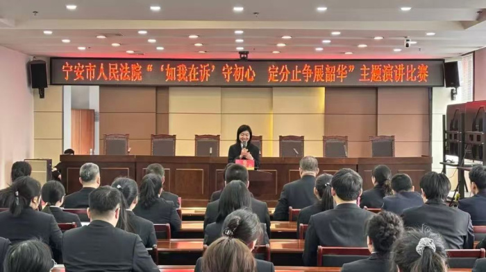为深入践行司法为民宗旨,推动最高人民法院“如我在诉”司法理念在基层法院落地生根,贯彻落实省法院龙法“文化铸品”十项建设要求,切实加强青年干警队伍建设,引导年轻干警树立和践行正确政绩观,近日,宁安法院隆重举办“‘如我在诉’守初心 定分止争展韶华”主题演讲比赛。院领导班子成员担任评委,近年来新入职的青年干警同台竞技,以声传情、以言践志,在交流感悟中凝聚司法为民的青春力量。