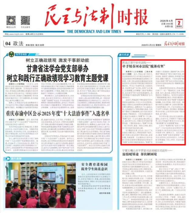 2026年4月2日,《民主与法制时报》发布《黑龙江省宁安市法院:牵手绥芬河市法院“脱薄攻坚”》,对宁安市人民法院与绥芬河市人民法院共同开展的党建引领结对共建系列活动进行报道。