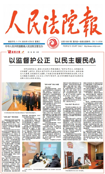 2026年4月8日,《人民法院报》第6版头条刊发《以监督护公正以民主暖民心》,对宁安市人民法院坚守司法为民初心,依法接受各界人士监督的经验做法进行报道。